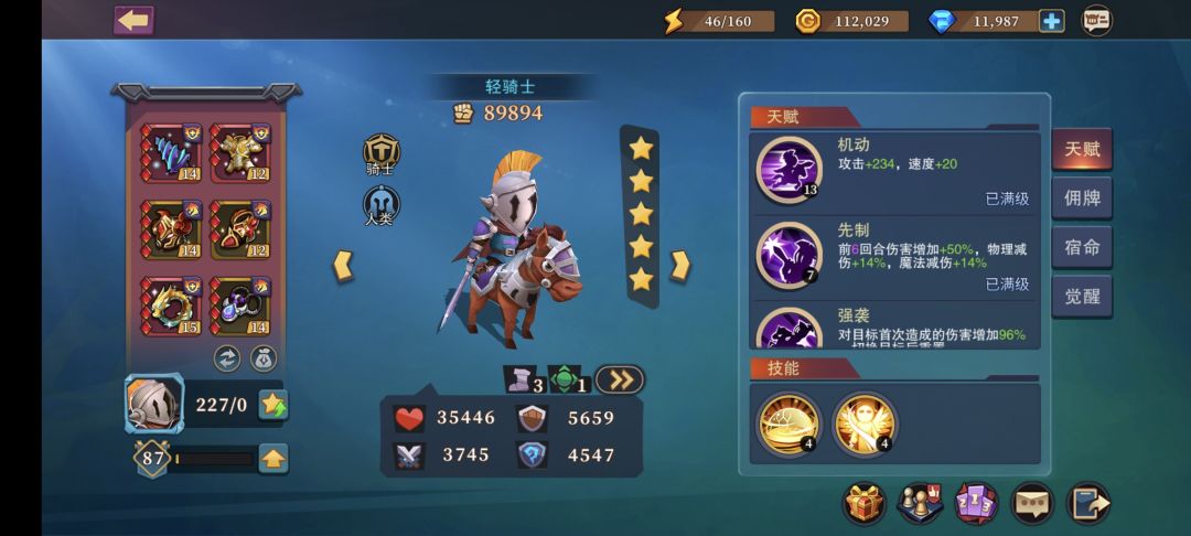 推荐:拥有6骑的玩家可以考虑养成,觉醒85需要点,强袭转盾值挺重要,符石选择3化盾的盾值效果(6化盾的突破上限对轻骑没必要,因为二进每回合都会直接把叠的盾值化成真伤打出去)和3魔徽,魔徽和3震裂相比倍数类似,而且震裂只有第一下,魔辉一直有效,但遇到冰魄/雷霆这类领域类法抗符文会有些许难受。