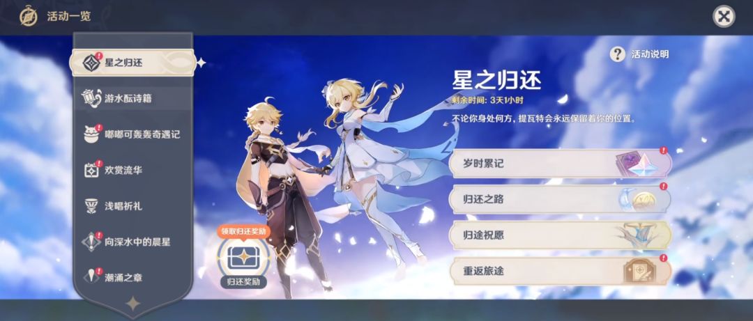 为了给旅行者更好的游戏体验,原神将于4.2版本对【星之归还】系统进行优化更新。在10月23日到4.2版本更新前,玩家暂时无法领取【星之归还】奖励。可能有不少小伙伴们还不知道这个系统,大部分玩家可能只是短暂性没有上线,但总体陆陆续续还是在玩。今天就来简单说下这个系统。【星之归还】奖励是啥?就是回坑奖励。基本所有手游都有类似的奖励,给退坑玩家一些奖励,毕竟玩家回坑不容易。在游戏里界面如下图: