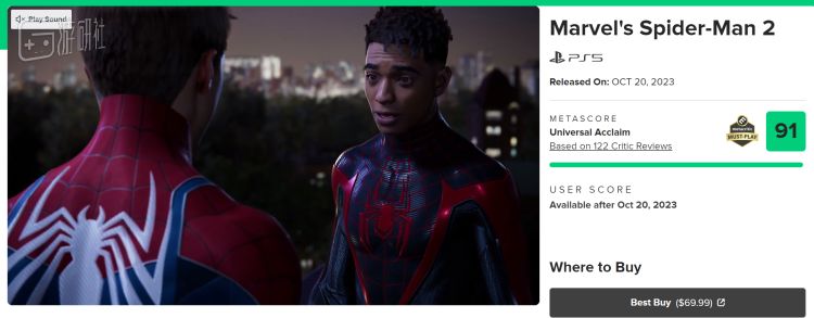 1.《漫威蜘蛛侠2》媒体评分解禁。目前MC 122家媒体均分91,其中IGN 8/10,GameSpot 8/10,Game Informer 9.5/10。