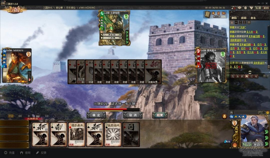 游戏开始王凌先用闪【驳龙】郭嘉卖血,郭嘉给铁索+五谷,然后【驳龙】杀一刀罗宪,由于手里还有闪,所以我铁索郭嘉和罗宪,继续用闪【驳龙】郭嘉,将罗宪压到两血,之后就是不断的【驳龙】罗宪,最后罗宪选择给牌,然后我酒杀将其带走。