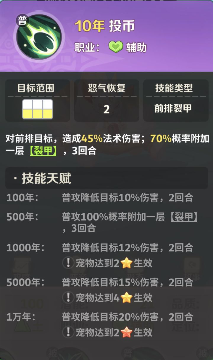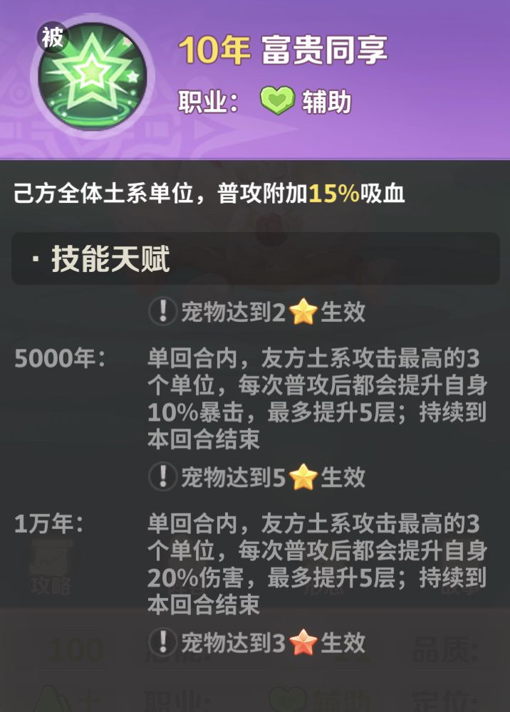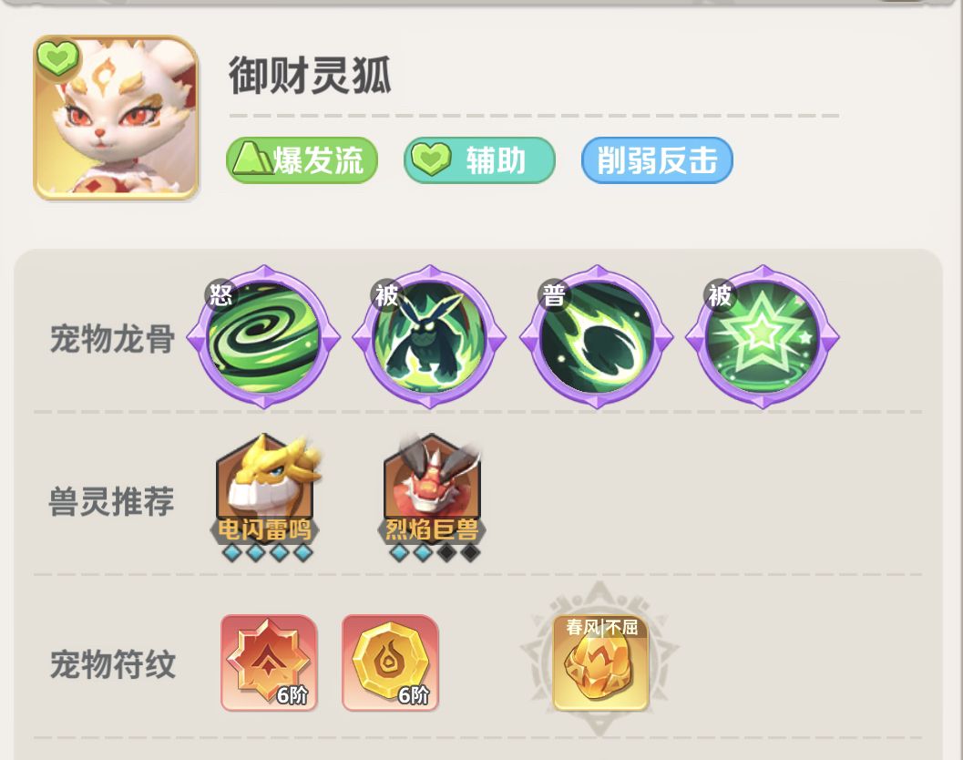 【特点介绍】:玩土必抽宠,可以说是把土系从深渊拉上岸的救援宠,能扛能打,给土系加BUFF,不仅能降低敌方对自己的控制减益效果,还能损耗自身一定血量保守卫不被控制,2星搭配万年龙骨更可以开局直接降低敌方对己伤害,美中不足是要练到3星,才能真正发挥灵狐的最大作用,需要花时间去培养。另外守卫是只会雇佣当前攻击最高的宠,前期需要与绵羊斥侯做取舍或根据场景互相搭配同时上阵,甚至在灵狐出来之前就已有大佬玩家开始准备第三套盾辅兽灵,阵容由2盾辅+2控+2强攻调整为3盾辅+1控制+2强攻,毕竟续航比控制更来得重要。