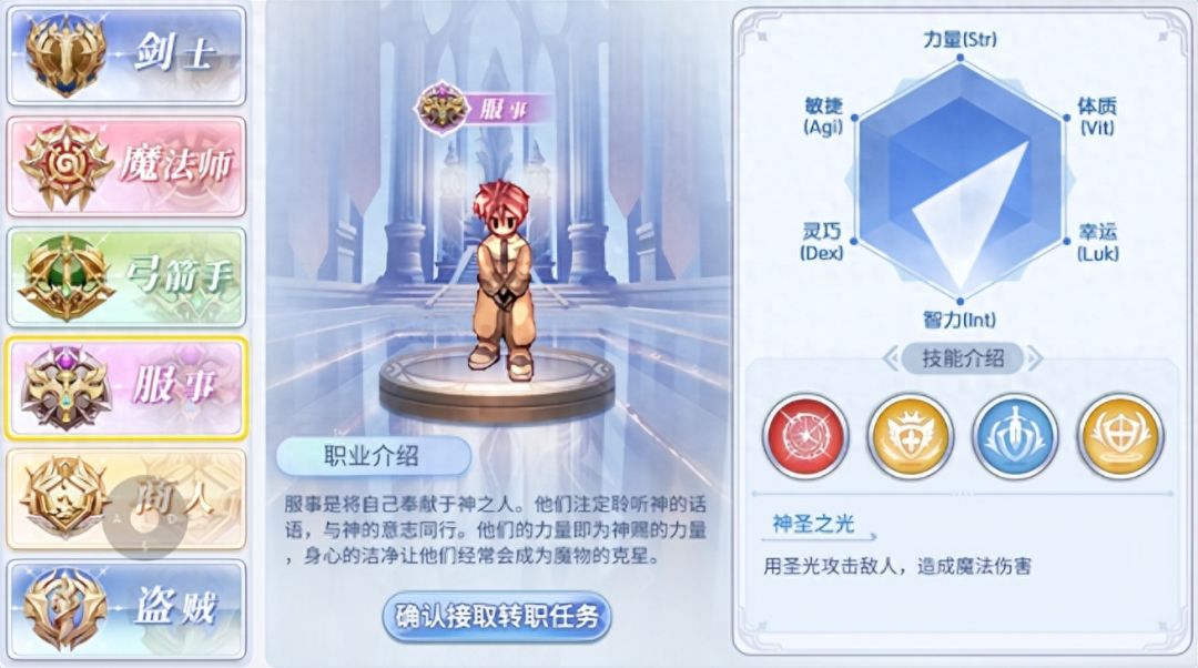 服事属于战斗支援职业,其职业特色是使用各类的辅助技能给队友附加各种增益的效果,比如回复队友的HP,提高队友的属性值等等。服事玩家应该要了解一个问题的关键,那就是队友不死,永远有翻盘的机会,队友不死的要求就是服事不能先死。可能看起来比较绕,简而言之一句话,服事没死,队伍就不会散!那么服事应该如何在残酷的战场上生存呢?这就涉及到三点属性,第一是防御,第二是血量,第三魔法值。这三点都可以依靠装备、卡片、装备强化、装备精炼等等来提升。