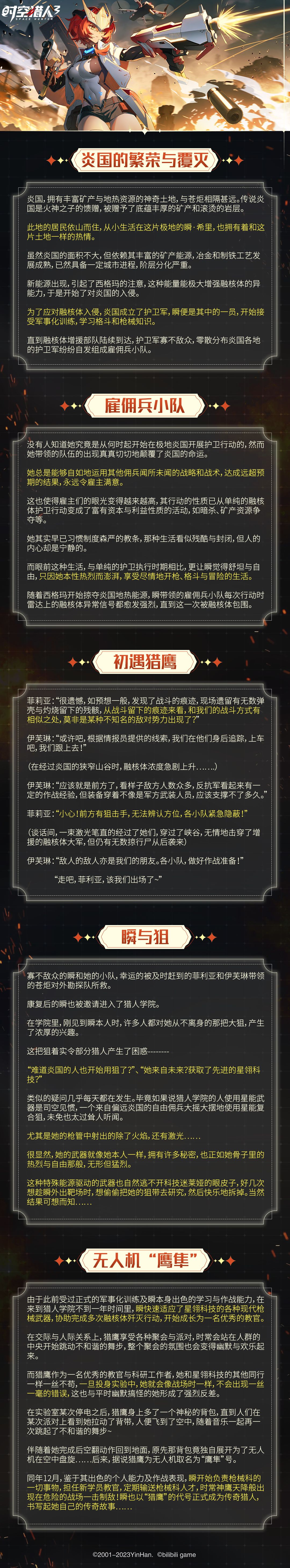 「猎鹰·瞬」出生在极地炎国的一个贫穷家庭,15岁时加入炎国护卫军,接受军事化训练,执行极限救援与融核体对抗任务。后因融核体势力加强及西格玛对炎国的侵蚀日益加重,护卫军被迫解散,零散的护卫军自发组成了雇佣兵小队。由于出色的单兵作战能力,越来越多的人加入了「猎鹰」的雇佣兵小队,为炎国做出最后的抵抗。