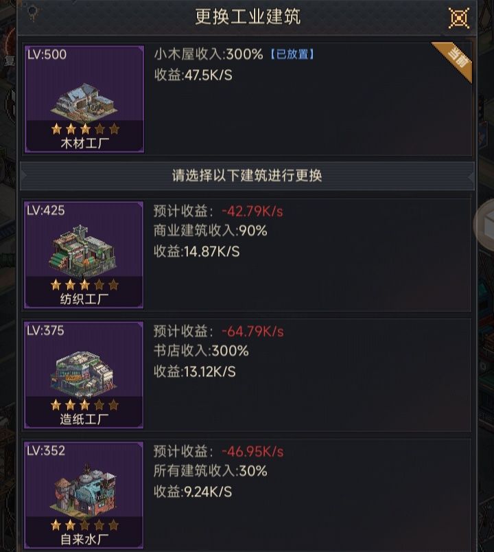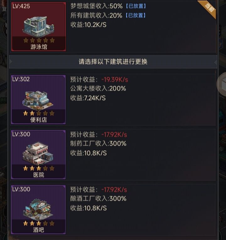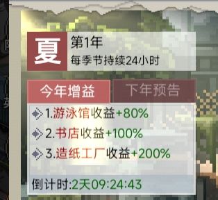 游泳馆是红色建筑,书店橙色,造纸工厂紫色建筑,这些都有额外的加成。