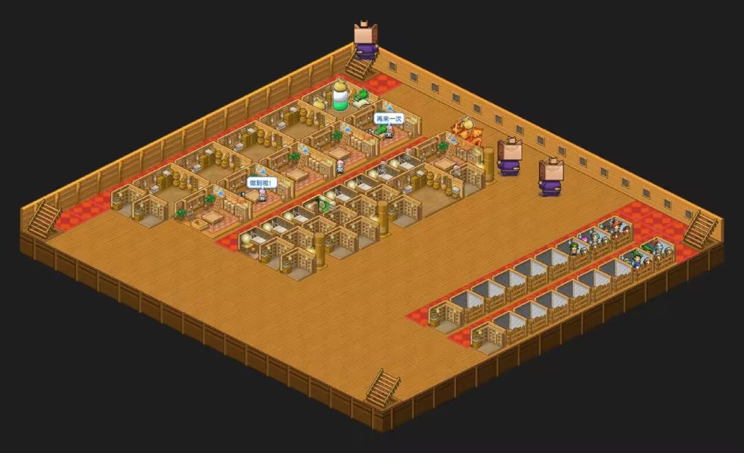 下层的布局如下,人物为药剂师,可以多再放点“远”知识建筑,方便药剂师转成忍者,转职路线为:药剂师-农民-王国兵(5精通)-忍者(10精通),都转成忍者后,红毛毯拆掉让忍者更容易抢到解析室。