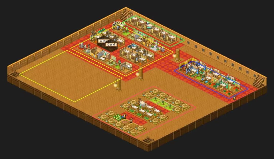 绿色区域为渔夫区,转成王国兵后只要挨近楼梯快点去打甲板就行。蓝色区域为商业区,任意6个工具人转成任意种类商人都行,周边建筑优先顺序为:幸运之鸟-绘画角-宝物资料馆-水槽,作用是周边商店商品更贵,当然不放也可以。黄色区域为知识区,如果工具人多也可以放空出来的黄色区域,红色区域为农业区,植树厂和农田都可以,收货的数值要400以上,周边放宠物屋可以收获更多物资,任意工具人转成农民,把装备下了,智力不能超过159。如果工具人过多,农民和农田树厂也要多点