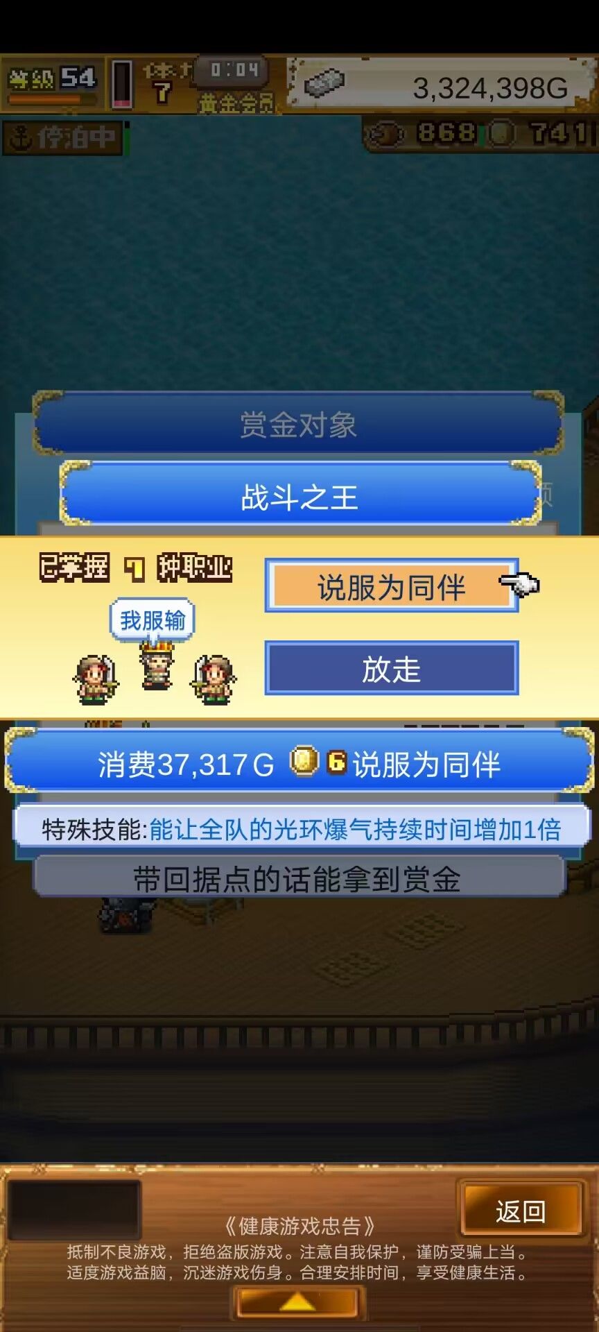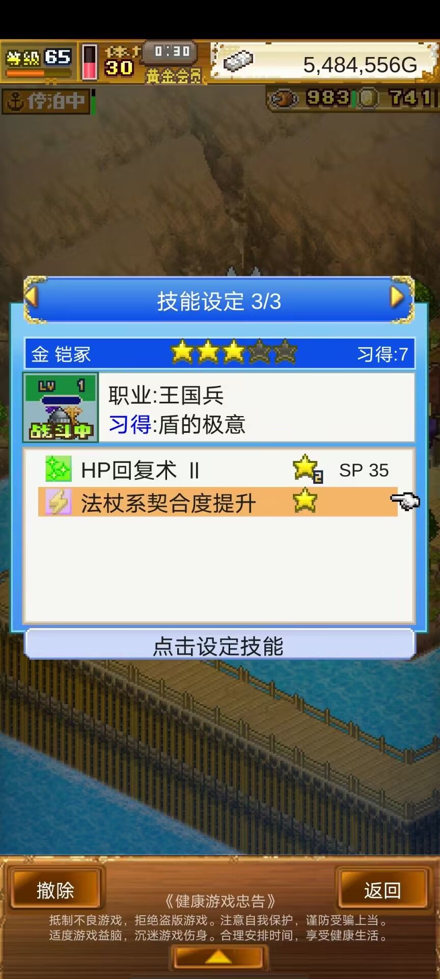 在2图打这个海贼船,这个船上有两个渔夫击败必定捕抓,击败渔夫就往《同伴名单》里把小刀下了,输了继续打,直到抓到6个1牌子渔夫再打赢这艘海贼船。不下小刀也打不赢可以多刷但是浪费时间。渔夫的房子建一起,周边放几个“秘”的建筑,知识“秘”等级1后再把渔夫上阵打甲板。渔夫转职顺序:渔夫-僧侣(2精通)-王国兵(5精通)-大王(10精通),前期只需要王国兵装精灵盾带治疗2,后面再转大王。