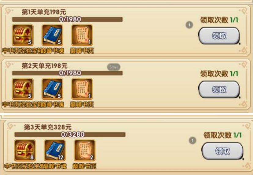 注意这个活动是需要一个一个来的,如果没有完成连续两天单充 198 的活动,是无法直接充值 328 就能完成第三