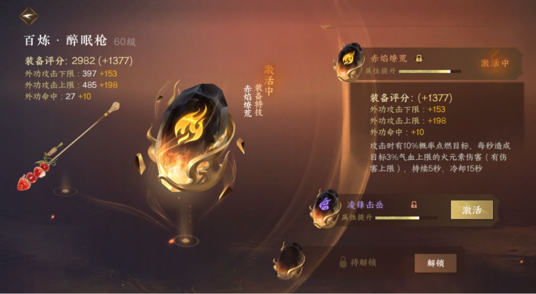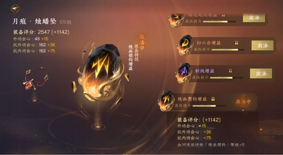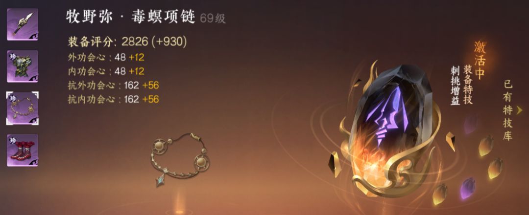 特技打造:我是这样佩戴的,没有让大家带,只是大家可以试试,假如你也没有金色刺挑和凌风的话!武器带的是【赤焰燎荒】因为没有其他金色,项链带的是【铁画银钩增益】因为我带的是三金三木内功周天,项链还是选择的【鹤唳长空】破防加成,还是因为没有震海潮生!