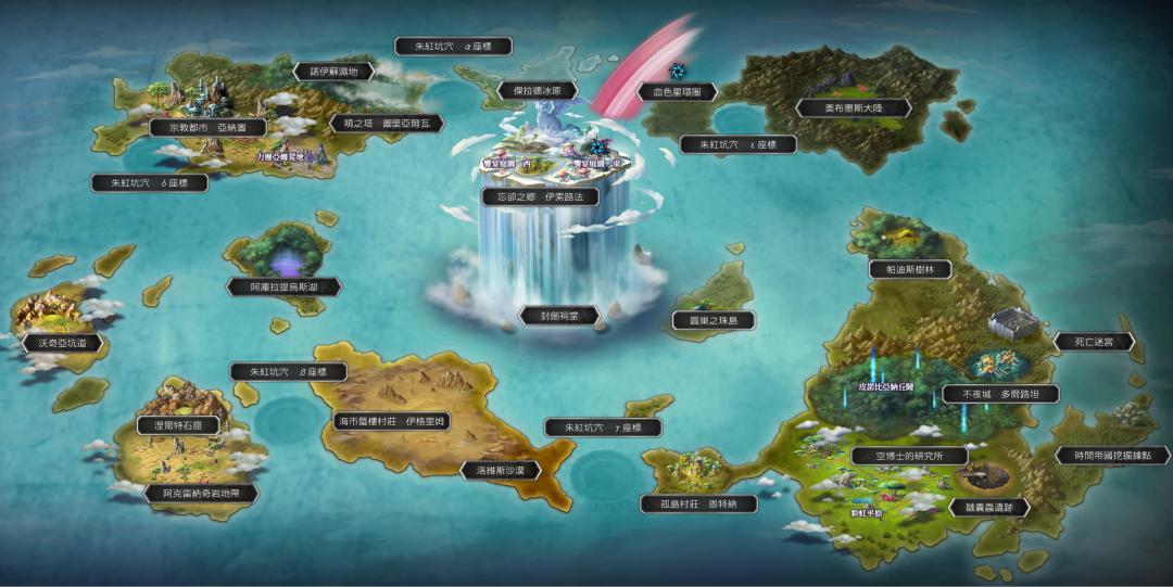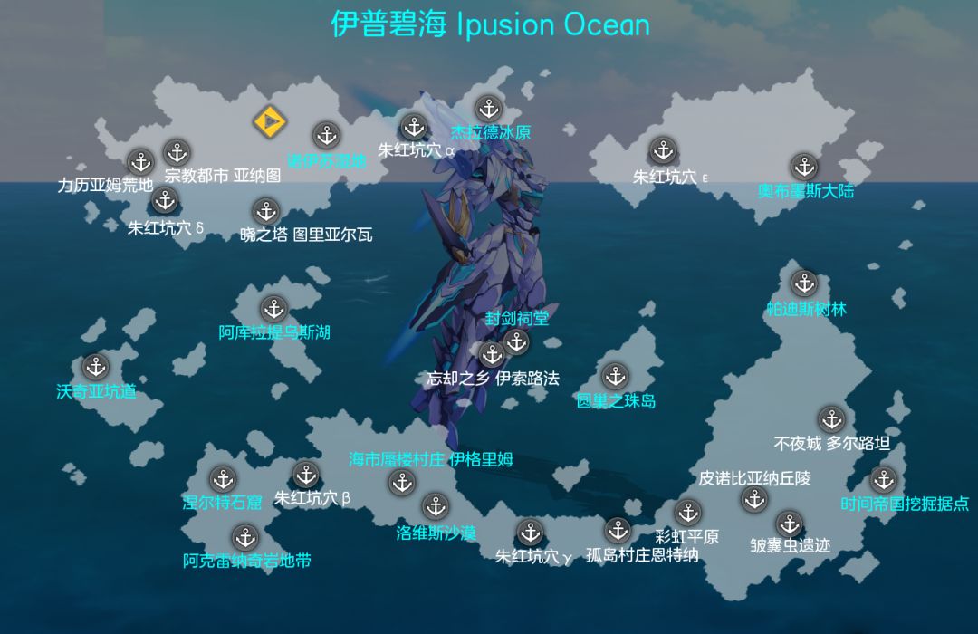 海域全图:球面地图,穿过地图左边缘会来到右边缘。血色星环圈并不在内(因为在天上),可从忘却之乡传送。
