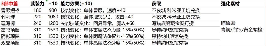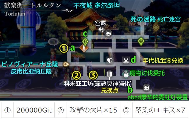 其他:①餐馆魔物讨伐委托 ②铁匠铺可兑换一套年代机武器(1200喵鲁姆×8) ③科米亚工坊兑换点
