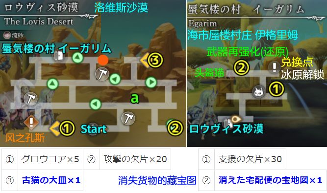 路线:洛维斯沙漠左上自动触发事件,获得猫咪邮政总部的信件→宗教都市猫咪邮政总部(出航图标右侧房间)对话→不夜城餐馆获取情报(3000喵鲁姆)→沙漠左上点击叹号,从矮到高依次点击4个仙人掌→海市蜃楼村庄伊格里姆解锁→兑换点购买极暖大衣(3000喵鲁姆),杰拉德冰原解锁