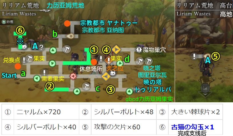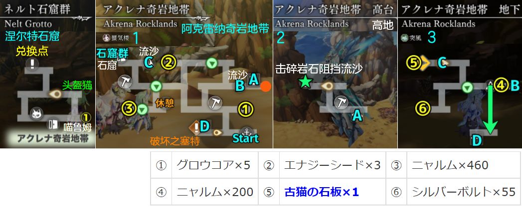 路线:飞过B处流沙进入A→击碎岩石阻挡流沙→涅尔特石窟→兑换点购买携带式发电机(3000喵鲁姆),用于探索沃奇亚坑道