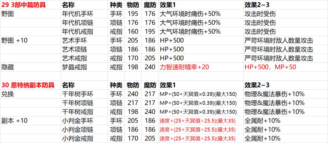 ⑧防具:年代机防具(野图素材)、艺术防具(野图素材 +10)、梦晶戒指(红色陨石任务)、千年树防具(副本兑换)、小判金防具(副本素材 +10)