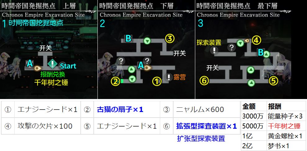 路线:入口处和士兵对话→最下层叹号处取得探索装置→返回入口处和士兵对话→罪恶冥神学会探索→各地使用探索技能并在挖掘点得到原石→交给士兵鉴定,根据鉴定金额获得报酬(图中右下表格,还清债务3000w,千年树之锤5000w,最高报酬梦书2亿)