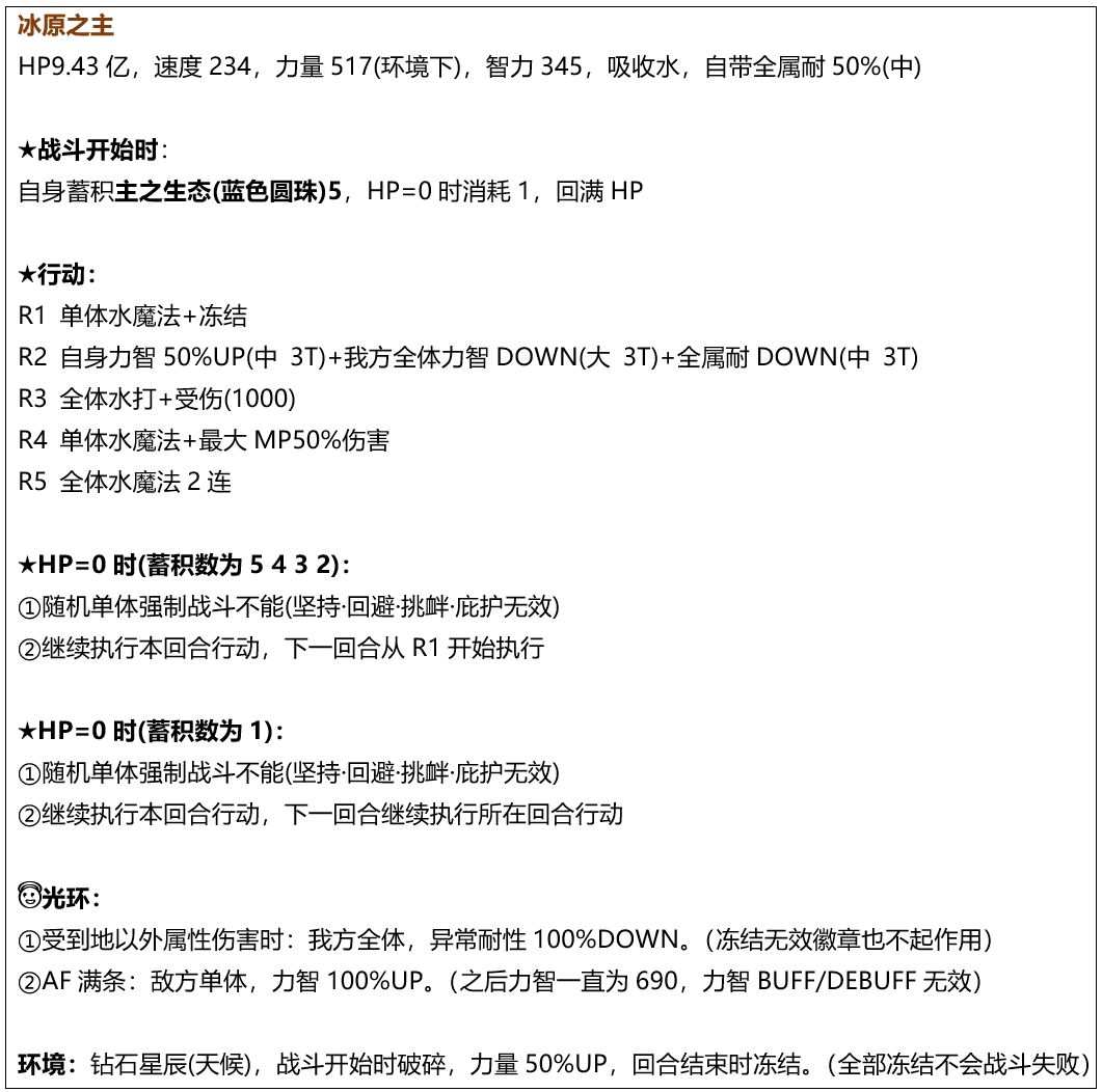 我的队伍:特点是①锁血时即死攻击,且继续行动,利用搭档提特拉的复活技能,即死的下一回合前排就恢复4人了,②回合结束时冻结,搭配光环,冻结无效徽章不起作用(所以徽章的效果可能只是耐性+100%),利用AS拉迪亚斯和AS伊法的防异常技能,可以不被冻结,必要时也可利用搭档装备逗海棒的充能技能解除异常。③AF满条后力智固定690,不受BUFF/DEBUFF影响,需注意及时开AF以避免光环发动。基本思想是所有攻击都集中在AS拉迪亚斯上。米娜尔卡可以换成任意输出角色,可以无限循环,后排角色没用到。战斗了50分钟,中间按错了几次,容错率比较高。由于只有水攻击,也可以用阿露缇娜当坦克。