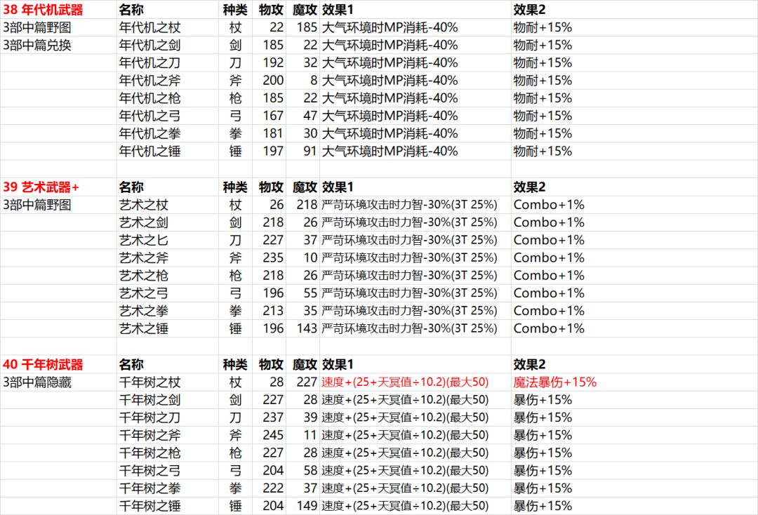 ⑦武器:年代机武器(兑换/野图素材)、艺术武器(野图素材 +10)、千年树武器(隐藏)
