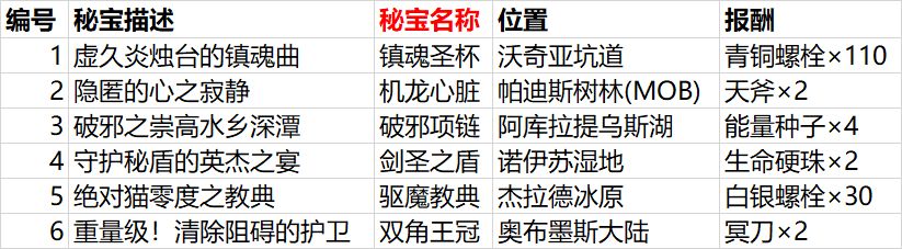 其他:①旅馆右侧兑换点 ②获得某处的钥匙后,去不夜城托尔路坦宫殿内右侧屋里,来到死亡迷宫,拿宝箱16 ③宝物猎人协会,寻找六大秘宝。古猫系列秘宝(共15个)的用途为兑换喵鲁姆。