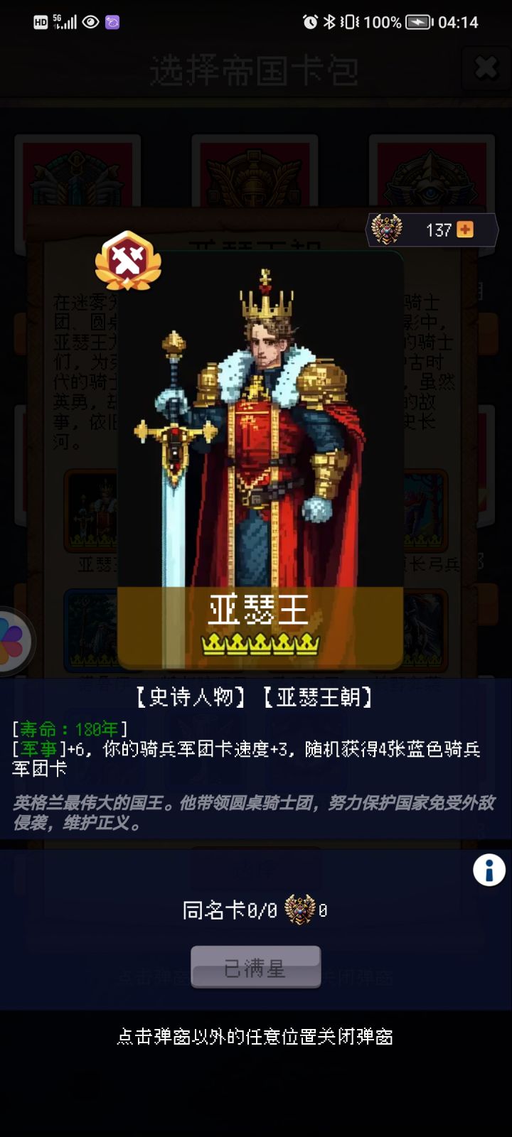 亚瑟王:军事+6,+3骑兵速,获得两张蓝卡骑兵。