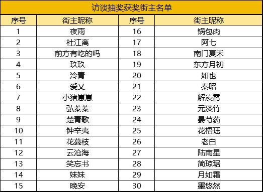 访谈活动已开奖!恭喜以下街主获得游戏十连抽!奖励将于本周内通过游戏邮件发送,请街主前往游戏邮箱领取奖励哦~