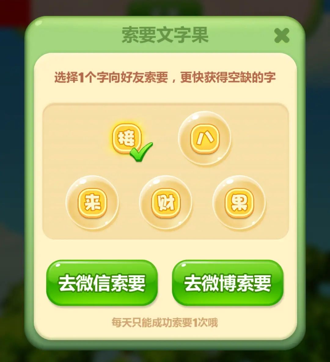 点击金银果树界面上方文字时,小村民之间还可互相赠送或索要,每日赠送次数没有上限,但最多索要成功1个文字,抓住机会多与乐友互相帮助,一起完成文字收集吧!