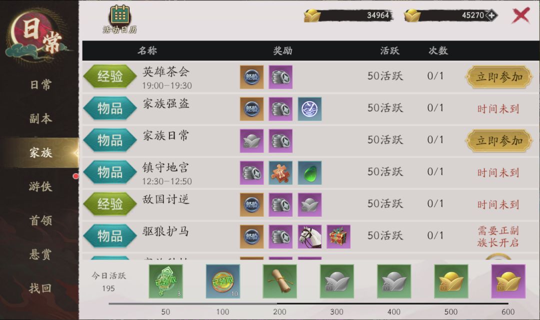 初入全战:45级加入家族后,如果族长有组织活动就参与,很多活动由族长管理时间的,注意留意家族公告,家族活动需要集体参加才能顺利通过,奖励也更加丰厚。更换家族冷却3分钟,尽量加入活跃的家族。家族任务也有经验,千万不要遗漏哦!