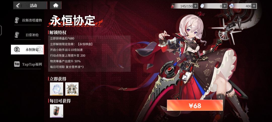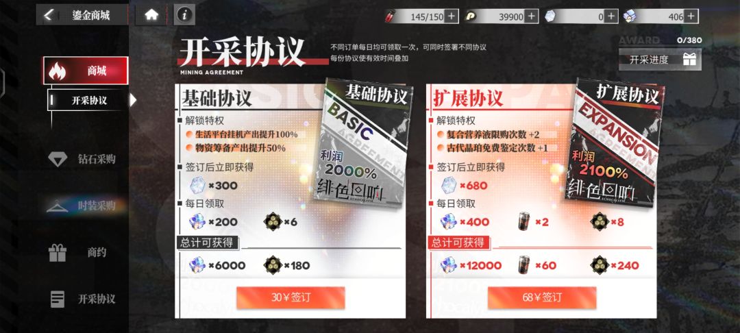 氪金玩家可以充值永恒协定获得战斗十倍速和各种特权,也可以充值两种大月卡获得部分收益效果。