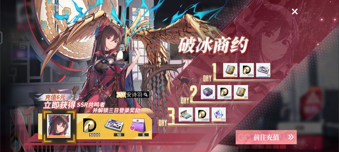2. 绯色回响资源补给:鉴定申请书*5+金币*50000+SSR亲密度自选箱*10