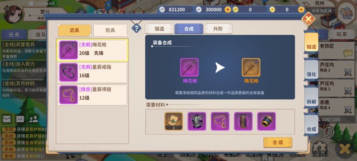 也就是5合1,比如5件紫装,合成1件橙装,合成装备的类型和第一件材料相同。