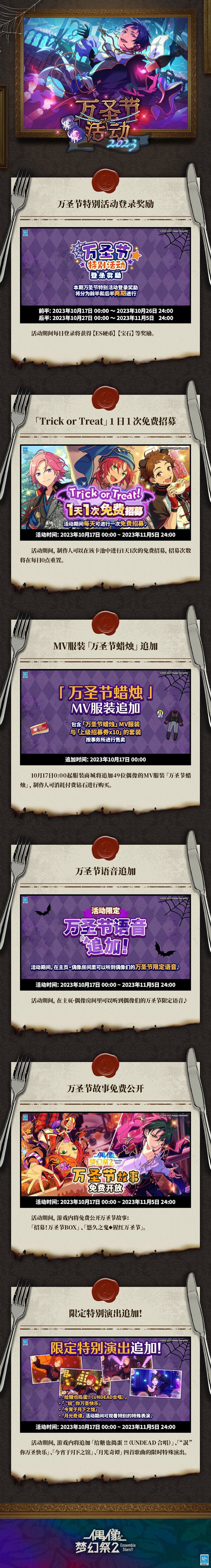 10月31日12:00 ~ 11月5日24:00活动期间,游戏内将追加「给糖也捣蛋!!」、「“詋”你万圣快乐」、「今宵于月下之馆」、「月光奇谭」四首歌曲的限时特殊演出。