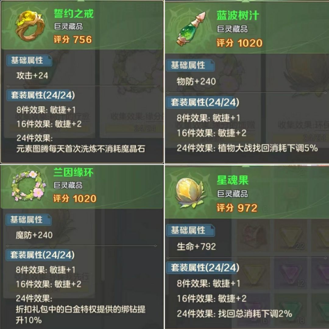 4.【星魂果】(收藏上限24件)基础属性:每收集1件获得:生命+33。套装属性:8件效果: 敏捷+1; 16件效果: 敏捷+2;24件效果:【环保我先行】找回总消耗下调2%。
