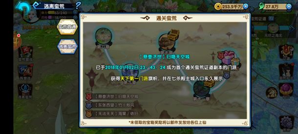 1:目前逃离蛮荒副本已经全部通关,有门派归隐天空城通关。永久开启七杀殿大门,可以领取脉灵,神器灵气,坐骑口粮。