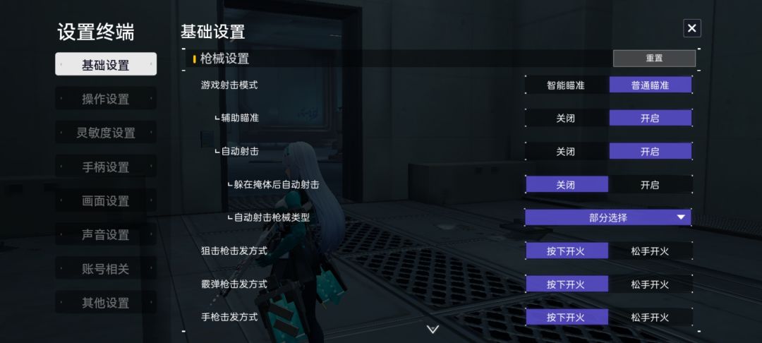 图6 枪械设置,这里选普通瞄准啊,会给你开启自动射击和辅助瞄准,不喜欢自动射击当我没说![[表情_叹气]](https://img-tc.tapimg.com/market/images/9598a6cd4e4eba8470eb1520ed6a885d.png)