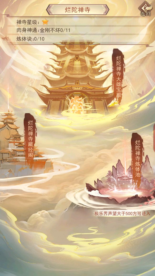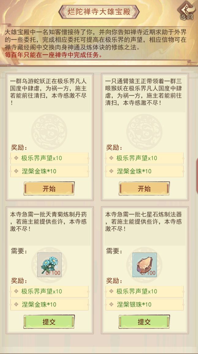 2.开启的禅寺越高级,就可以选择在更高的禅寺大雄宝殿获得越多。每百年只能选择一个禅寺获得