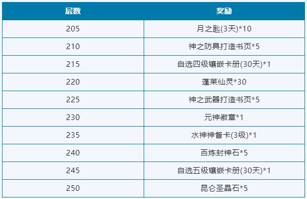 在200层到250层中奖励除了活跃之心之外,每隔5层还有昆仑圣晶石、百炼封神石、自选五级镶嵌卡册(30天)等奖励~