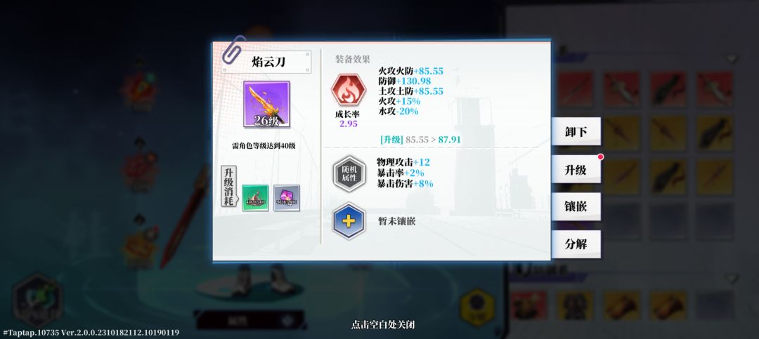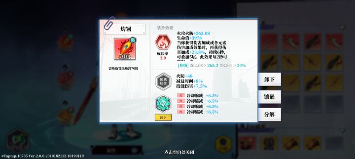 装备必带灼翎,沉香墨玉,焰云刀,鸾羽蒲团,水杖,最后一件自己选择。最后三张图是我带的残魂,以及我的局外面板和局内面板(火攻玉和爆伤玉合炸了,超级大爆炸那种,所以只带了四个玉面板不高)通关视频放在我主页置顶,大家可以根据视频自己推测强度。