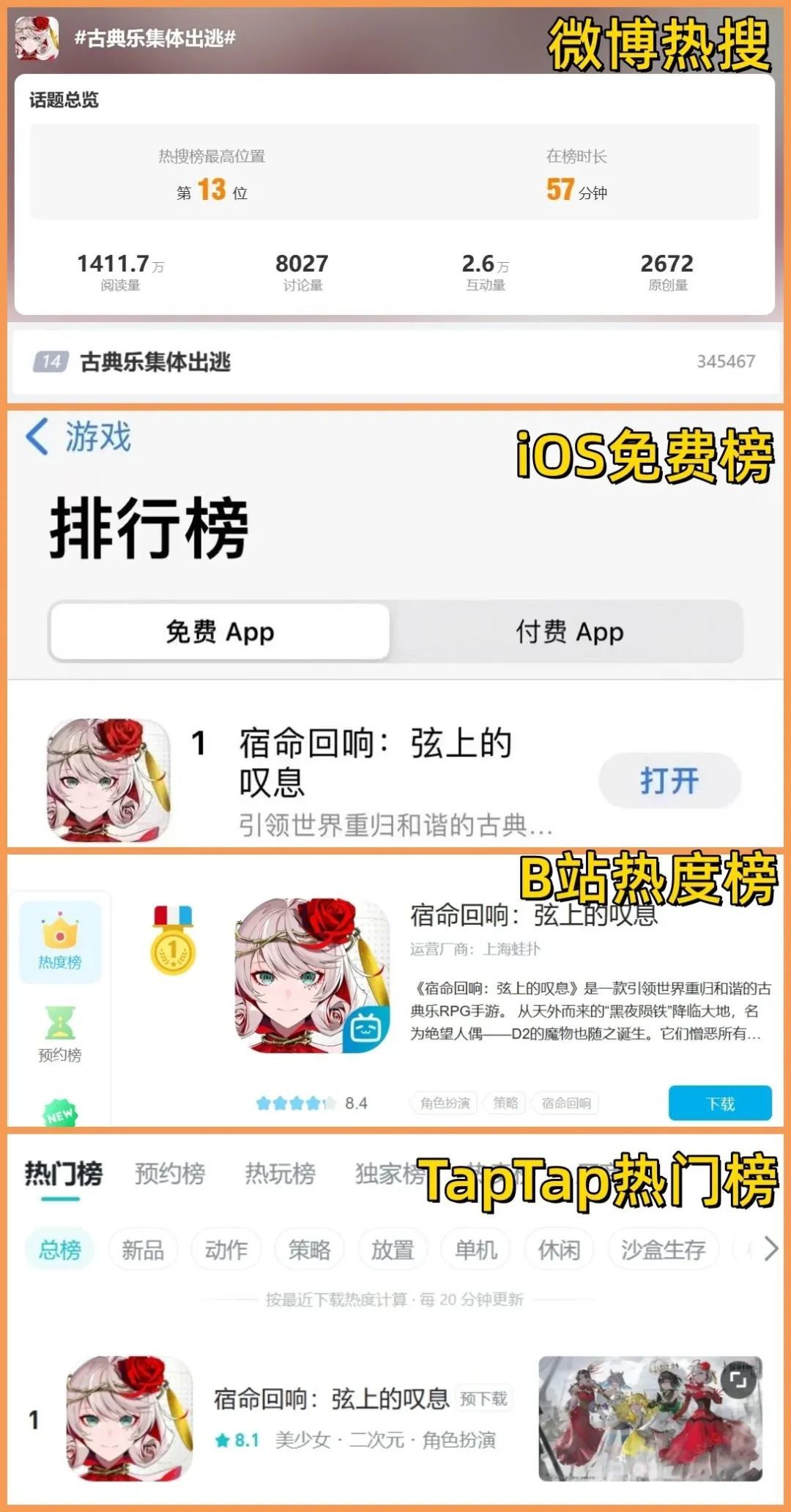 iOS免费榜第一、B站热度榜第一、TapTap热门榜第一,微博话题#古典乐集体出逃#还冲上了热搜,可以说今日上线的《宿命回响:弦上的叹息》(后文简称《宿命回响》)在开局就狠狠地刷了一波存在感。