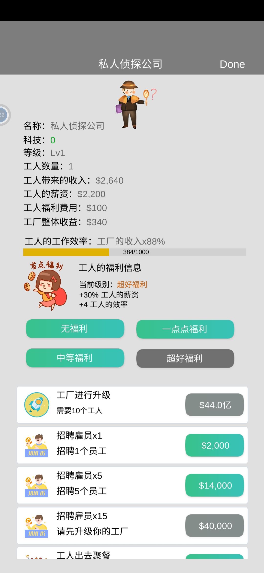 刚刚试了一下,只雇用1个人,选择超好福利,每周会自动增加4点工作效率,这时候就可以放着不管了,继续快乐的打工,等到工作效率长到1000,再来把福利调整成中等福利,不会掉工作效率,就可以开始快乐的招人了