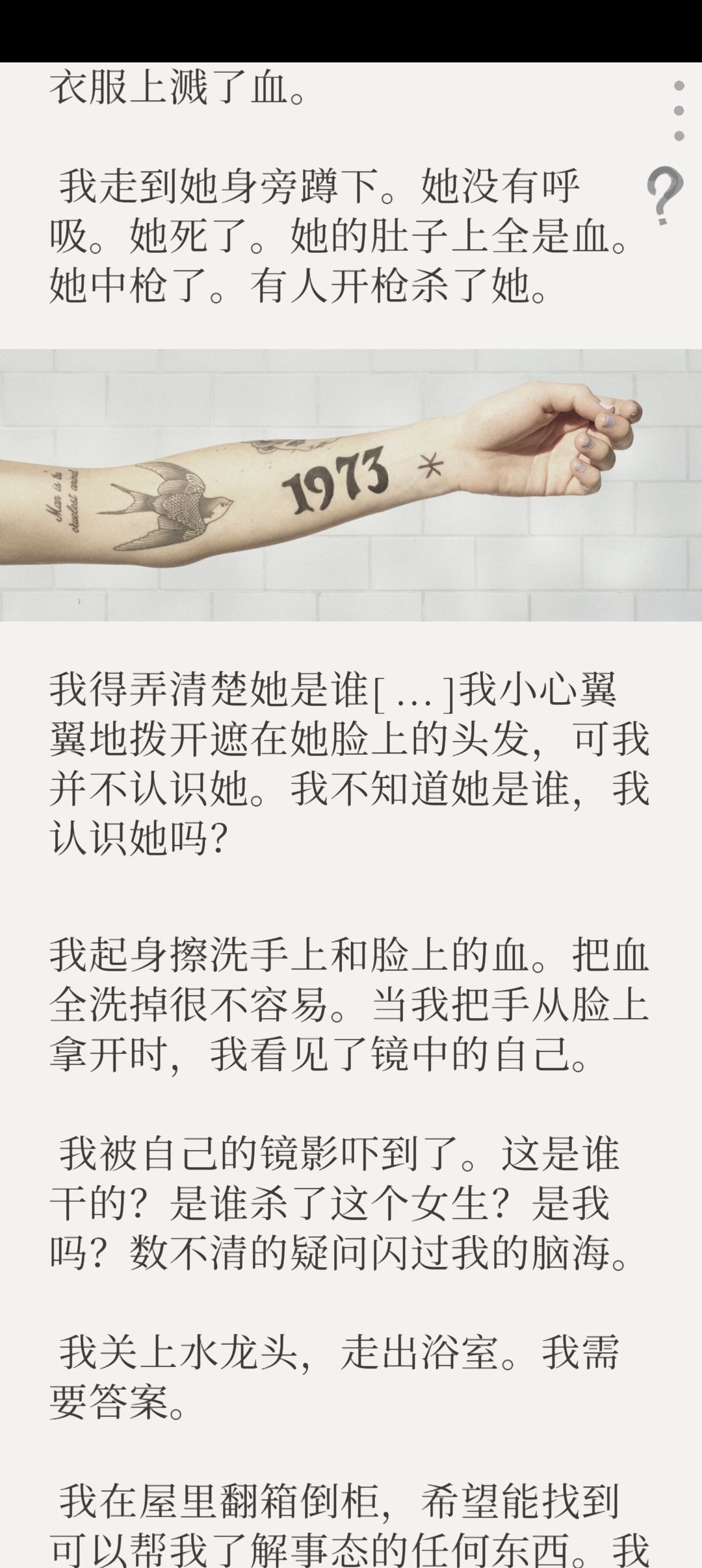 1.查看手臂纹身数字,需要让手机头部倾斜朝下,手机重力感应到,游戏图片里的手就会翻面。可以得到数字1973