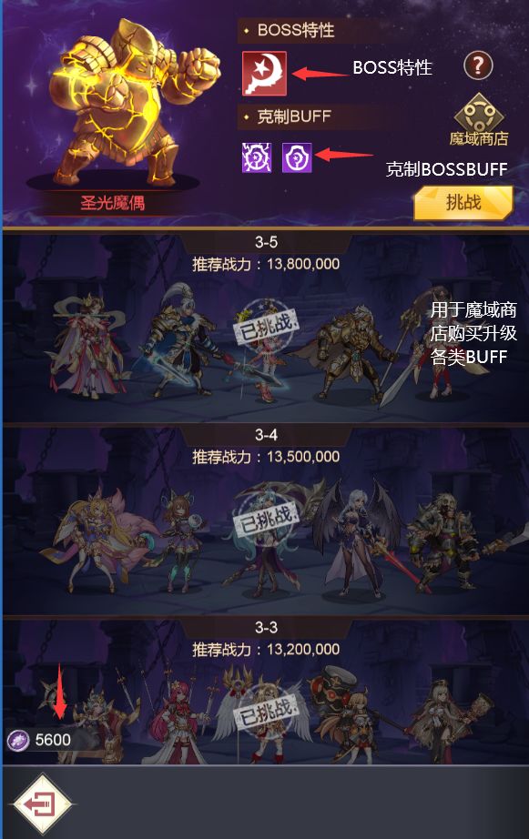 3、玩家挑战过程中可获得魔域币,可购买增益BUFF,以及克制BOSS的对应BUFF