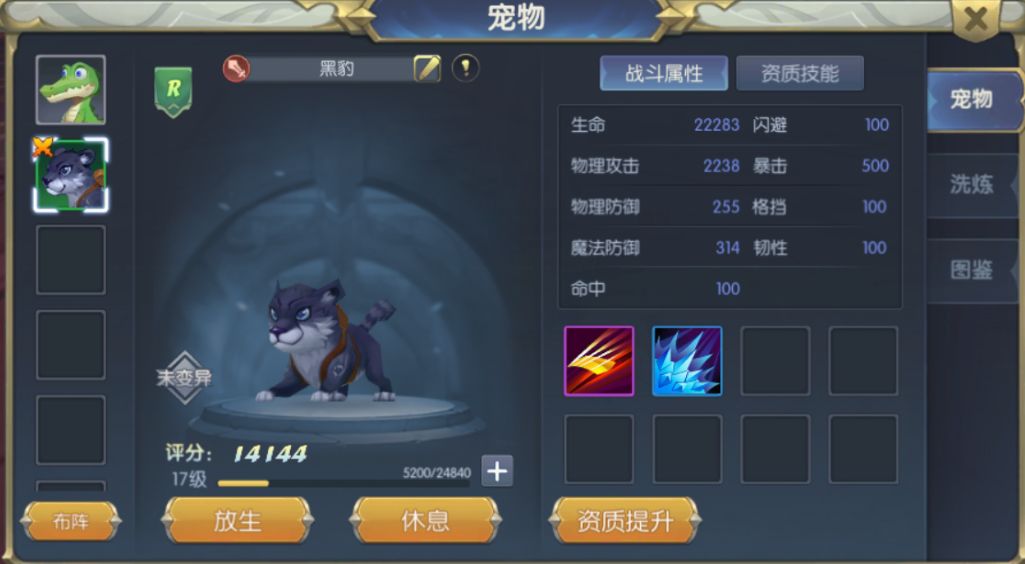 宠物培养:宠物可以学习不同的技能,最多可学习8个,除2个主动技能外,8个被动技能,通过洗练和技能书学习可以获得。