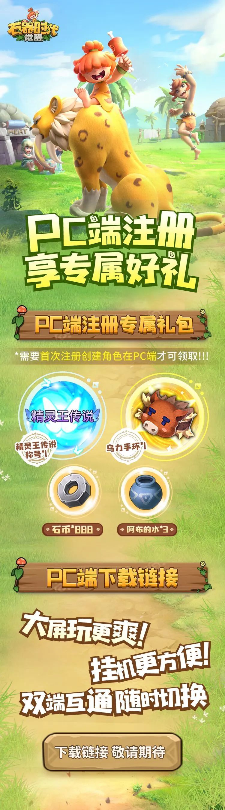 ,内含精灵王传说称号、乌力手环、石币等游戏道具助力成长。(注:需要首次注册创建角色在PC端才可领取)