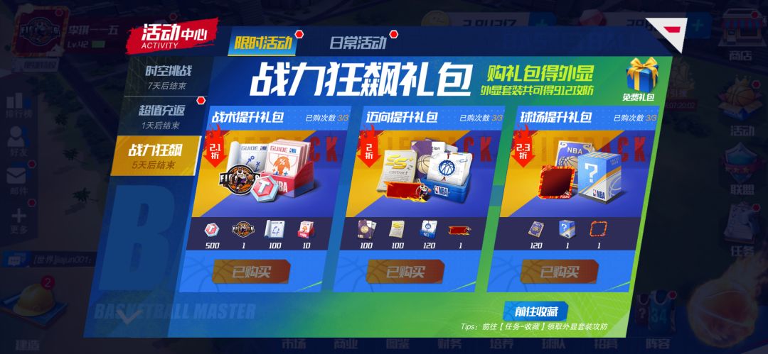 战力大礼包限时直购,购礼包得外显,还可以得到额外的攻防加成!(新增默契状态礼包,可以获得中级默契礼盒、心态进阶课程,助你提升默契等级!)