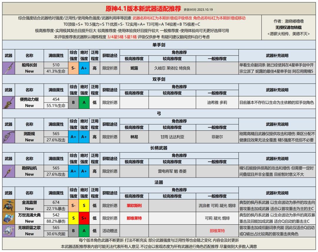 全武器评级推荐能够方便旅行者们分配现有武器,并为未来做一些武器抽取规划。另外为配平成本,武器精炼统一为5星武器精1、4星武器精5。