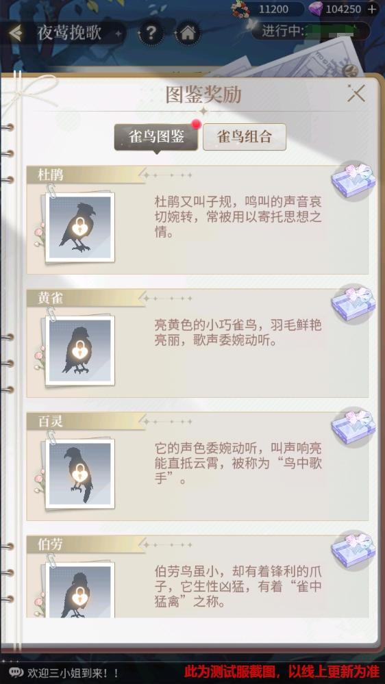 收集图鉴中的雀鸟可以获得道具奖励