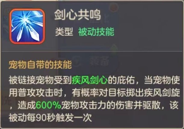 增加了【剑心共鸣】的被动技能:被链接宠物受到疾风剑心的庇佑,当宠物使用普攻攻击时,有概率对目标掷出疾风剑旋,造成600%宠物攻击力的伤害并驱散,该被动每90秒触发一次。