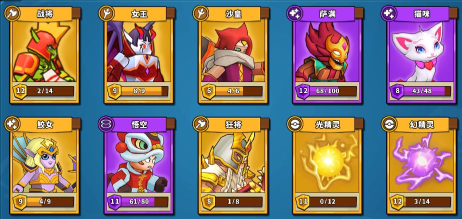 战将、女王、沙皇、萨满、猫咪、鲛女、悟空、狂将、光精灵、幻精灵