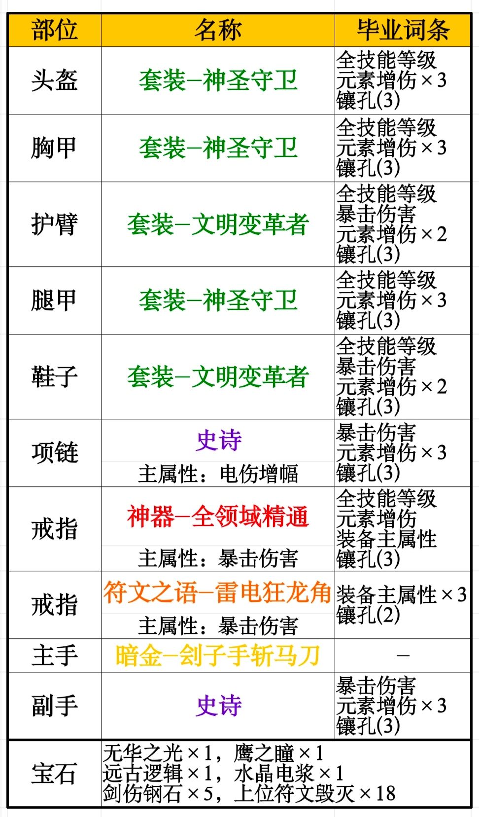 防具:神圣守卫3件套对核心技能雷域加成巨大,另外两件选择文明变革者护臂和鞋子。