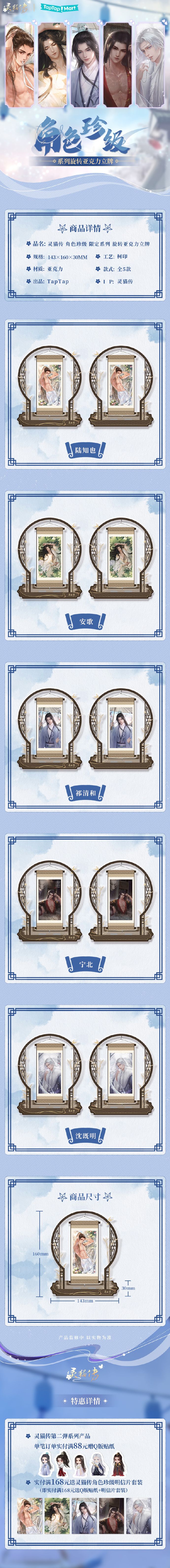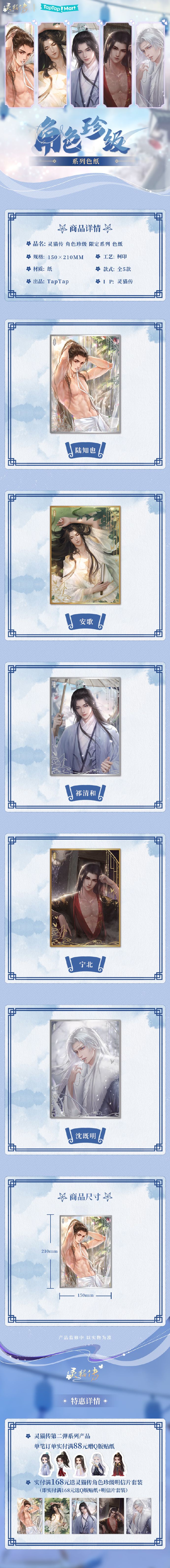 赠品活动:灵猫传第二弹系列周边,实付满88元赠送Q版贴纸套装1份、实付满168元送Q版贴纸套装1份+角色珍级系列明信片套装1份。
