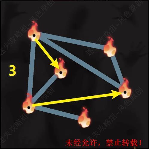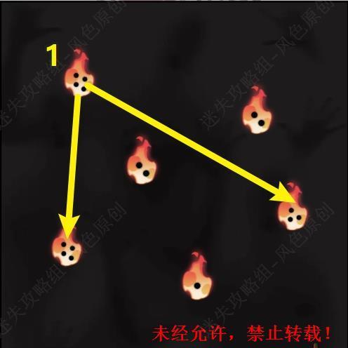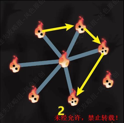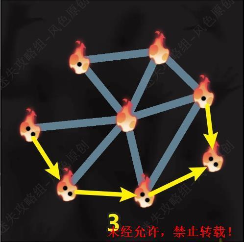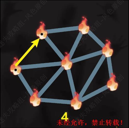 29.场景中的两个火焰图标相连即可为彼此都减少一个黑点,需要将所有的黑点都清零,同时火焰图标之间相连的路线不可相交。第一关的连接顺序,第一步。 29